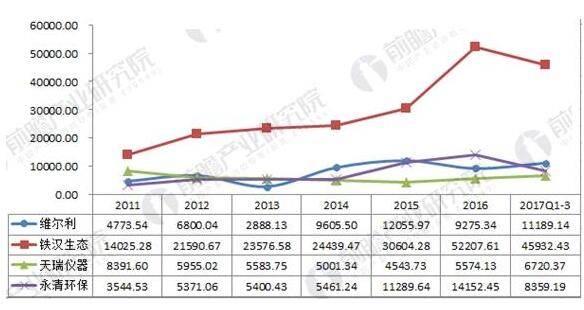 2011-2017年(nián)我國(guó)土(tǔ)壤修複主要上市企業淨利潤比較(單位:萬元)