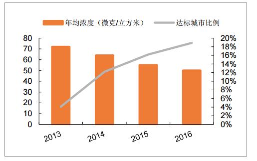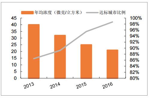 3、我國(guó)大(dà)氣污染物中SO2治理(lǐ)已取得(de)較大(dà)進展,PM2.5達标城(chéng)市比例仍處于較低水平,将是未來(lái)治理(lǐ)重點。工業企業排污是造成PM2.5超标的主要原因。2014年(nián),我國(guó)火(huǒ)電超淨排放(fàng)标準推出,以顆粒物爲例,超淨排放(fàng)标準爲10微克/立方米,相(xiàng)比舊标20微克/立方米的特别排放(fàng)限值下降50%。火(huǒ)電裝機(jī)主要集中在五大(dà)電力集團,易監管且實施超淨排放(fàng)改造有相(xiàng)應補貼,多數情況下可(kě)覆蓋治理(lǐ)成本,因此推進速度較快(kuài)。2016年(nián),各電力集團超淨排放(fàng)機(jī)組功率占在運營總機(jī)組的比例都(dōu)已達50%以上。截至目前,我們預估火(huǒ)電超淨排放(fàng)改造完成率超過65%,剩餘市場空間約140億元左右。